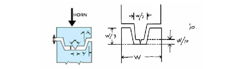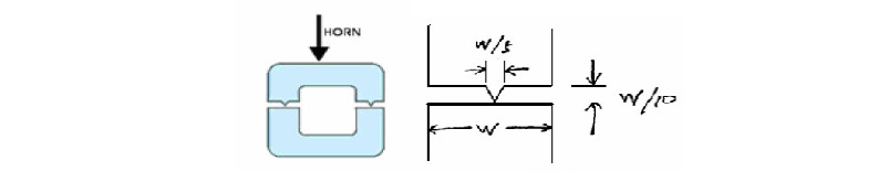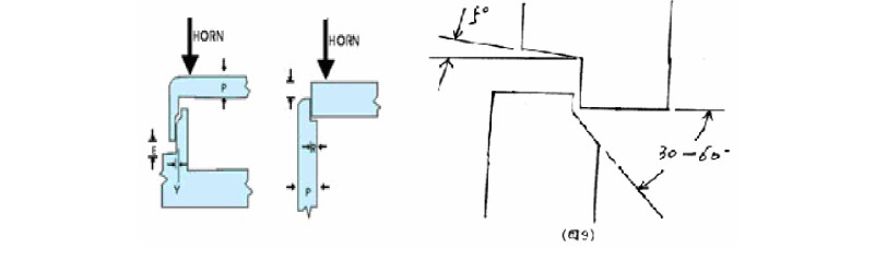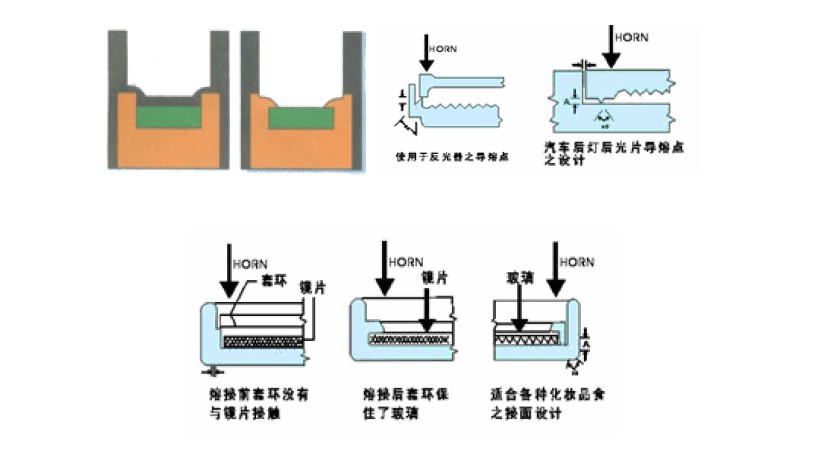 1、 导能三角形焊面 图 在两块塑料接面的一边,沿着焊面、加一条小三角形凸缘。这凸缘将超声波振动聚集在三角的尖端,由此减小焊件的接触面积,而形成集中的超声波能量。溶解的塑料均匀地流满焊面,产生坚固的接合力,而且能大量减少焊接时间。