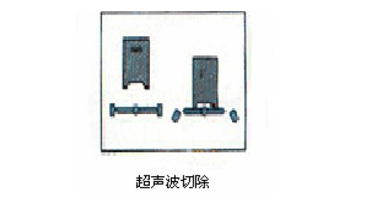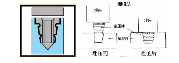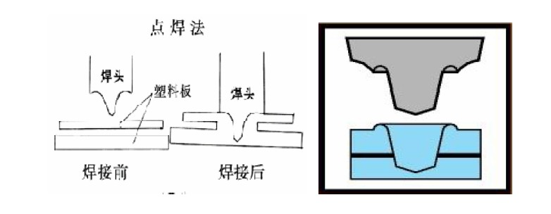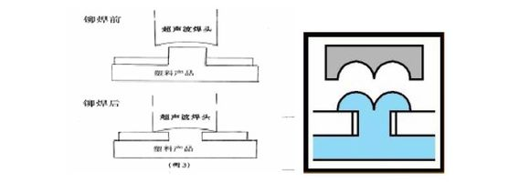 此方式用于两件不同材料的塑料件,一方为一塑料铆钉贯穿另一件材料,焊头焊接面设计成铆钉包覆状。高频震动生热令塑料钉熔解成型包覆在另一件材料上。将超声波超高频率振动的焊头、压着塑料品突出的梢头,使其瞬间发热融成为铆钉形状,使不同材质的材料机械铆合在一起。