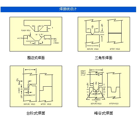用剪切接。需要高强度,高质量接碚的环形和矩形制件都用剪切接头。剪切接头号具有搭接制件壁部分,当接头被焊接和相互依次嵌入时,搭接部分产生公差和局部剪切。为了促进制件找平,接头包含了调节部分。为了集中熔融能量,一边上的阻碍物的顶角在初始接触面上降低。因为融化材料的温度在整个接触面上保持一致,制件被焊接时,两表面熔融均匀。深度为1.0-2.0mm的使用0.13-0.5mm范围内的公差值。为了防止在焊接过程中由于公差而产生的外部侧壁翘曲,垂直的制件应尽可能浅,但在一边用剪切制件改进的槽舌接头可与较深的拉伸制件一起使用,提供中壁接头,它使由于公差而产生的侧壁翘曲最小。如图5所示。